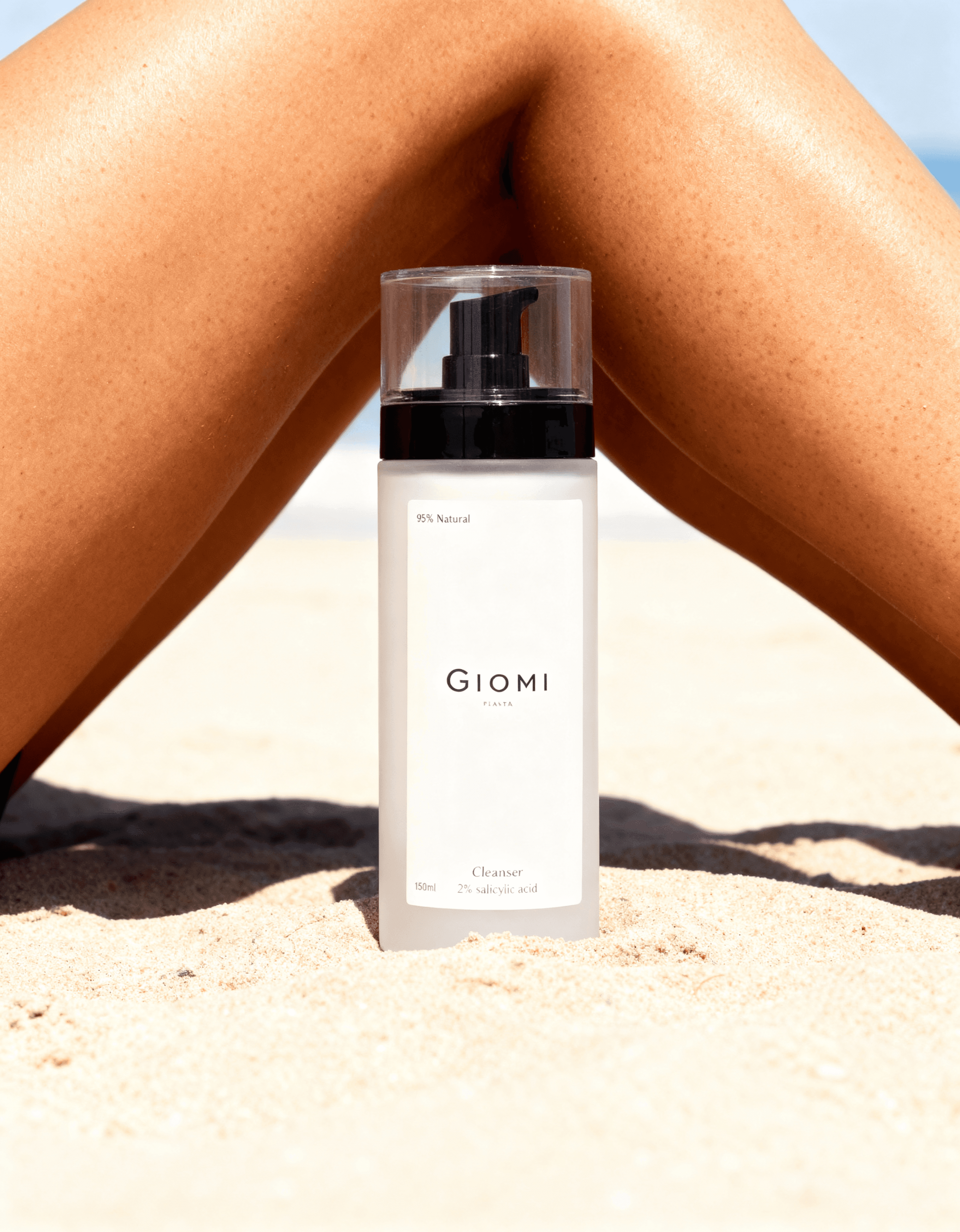Alongside two hero clips, one featuring a surreal Giomi boutique in a sunlit Sicilian street, and another where the cleanser appears oversized on a tuk-tuk driving along a coastal mountain road.